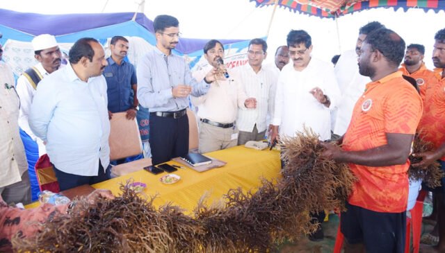 చిన్నగంజాం (DN5 News) : సముద్రపు మొక్కలు పెంపకంలో మహిళల తలసరి ఆదాయం పెరుగుతుందని కలెక్టర్ డాక్టర్ వినోద్ కుమార్ (Collector Dr.V.Vinod Kumar IAS) చెప్పారు. మండలంలోని పెద్దగంజాం ఏటిమొగ గ్రామంలో సముద్రం మొక్కల పెంపకం యూనిట్ ను పరిశీలించారు. రాష్ట్రంలో ప్రయోగాత్మకంగా సముద్రంలో చేపట్టిన మొక్కల పెంపకం యూనిట్, సాగు విధానం పరిశీలించారు. మత్స్యకార మహిళలు పొందుతున్న ఆదాయంపై వివరాలు అడిగి తెలుసుకున్నారు. అత్యంత తక్కువ పెట్టుబడితో అధిక లాభాలు గడించే సముద్ర మొక్కల పెంపకం, మార్కెటింగ్ విధానాలపై ఆరా తీశారు. ఎన్నో పోషక విలువలు, ఔషధాల కొరకు వినియోగించే సముద్ర మొక్కల పెంపకంతో మత్స్యకార మహిళల జీవితాలు మారిపోనున్నాయని చెప్పారు.