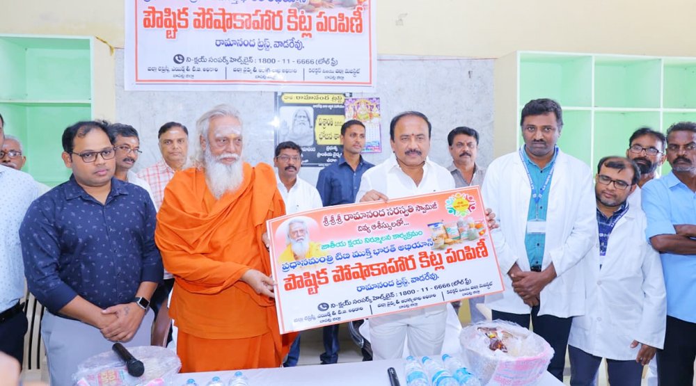 చీరాల (Chirala) : వాడరేవు శ్రీశ్రీశ్రీ రామానంద సరస్వతి ట్రస్ట్ ఆధ్వర్యంలో భూరీ విరాళం ప్రకటించారు. చీరాల ప్రభుత్వ ఏరియా వైద్యశాల ఆవరణలో స్వామి శ్రీశ్రీశ్రీ రామానంద సరస్వతి స్వామి (Ramananda Saraswathi) వారి దివ్య ఆశీస్సులతో సామాజిక సేవా కార్యక్రమాలు ప్రారంభించారు. శాసన సభ్యులు ఎంఎం కొండయ్యతో (MLA MM Kondaiah) కలిసి పేదలకు వైద్య సహాయం, పేద విద్యార్ధులకు ఆర్ధిక సహాయం, కుష్టు రోగులకు ఆరు నెలలపాటు సుమారు 200మందికి పౌష్టికాహార కిట్లు పంపిణీ వంటి సేవా కార్యక్రమాలు శుక్రవారం చేపట్టారు. జాతీయ క్షయ నిర్మూలన కార్యక్రమం ప్రధానమంత్రి టీబీ ముక్త్ భారత్ అభయాన్ పౌష్టిక పోషకాహార కిట్లు పంపిణీ చేశారు. పేరాల ఓంకార క్షేత్రం నిర్మాణానికి రూ.2లక్షలు, లింగాపురం శివాలయంలో విగ్రప్రతిష్టకు రూ.ఒక లక్షల విరాళం అందజేశారు.