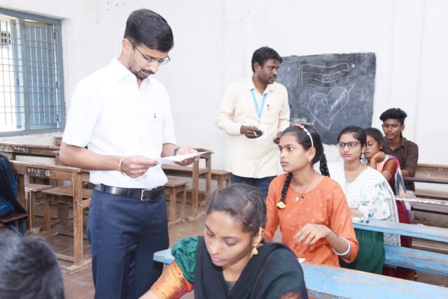 బాపట్ల (DN5 News) : ఇంటర్మీడియట్ పరీక్షా కేంద్రాల వద్ద భద్రత ఏర్పాట్లు పక్కాగా అమలు చేయాలని కలెక్టర్ డాక్టర్ వి వినోద్ కుమార్ (Dr.V.Vinod Kumar IAS) తెలిపారు. చెరుకుపల్లి మండలం కావూరు, చెరుకుపల్లి గ్రామాల్లోని ప్రభుత్వ, ప్రైవేటు జూనియర్ కళాశాలలోని పరీక్షా కేంద్రాలను ఆయన శుక్రవారం ఆకస్మికంగా పరిశీలించారు. ఇంటర్మీడియట్ పరీక్షలు ప్రశాంత వాతావరణంలో నిర్వహించాలని పరీక్షా కేంద్రాల చీఫ్ సూపరింటెండెంట్లను ఆదేశించారు. ద్వితీయ సంవత్సరం పరీక్షలు రాస్తున్న విద్యార్థుల తీరును పరిశీలించారు.