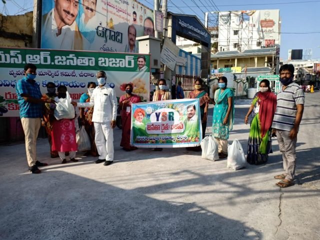 చీరాల : లాక్ డౌన్ పొడగింపు కారణంగా పనులు లేక ఇబ్బంది పడుచున్న పేదలకు తక్కువ ధరలకే కూరగాయలు పంపిణీచేయాలన్న ఉదేశ్యముతో సీఎం జగన్ మోహన్ రెడ్డి ఆదేశించారు. చీరాల ఎఎంసి చేపట్టిన సంచార కూరగాయల విక్రయ కార్యక్రమానికి జిల్లా కలెక్టర్ పోలా భాస్కర్ వైయస్సార్ జనతా రైతు బజార్ గా నామకరణ చేశారు. రాష్ట్రములోనే జిల్లాలో మొట్టమొదటిగా ఏఎంసీ ఆధ్వర్యములో వైసిపి నియోజకవర్గ ఇంచార్జి ఆమంచి కృష్ణ మోహన్ సలహాతో మహిళా సమాఖ్య ద్వారా రూ.100కే 13 రకాలైన కూరగాయలు పంపిణీ కార్యక్రమాన్ని చీరాల నెహ్రు కూరగాయలు మార్కెట్ వద్ద ఆదివారం చేపట్టారు. కార్యక్రమంలో ఏఎంసీ చైర్మన్ మార్పు గ్రెగొరీ, డైరెక్టర్ కనపర్తి బజ్జిబాబు, చుక్క బుజ్జి, ఏఎంసీ సిబంది, మండలి సమాఖ్య సభ్యులు, వైస్సార్సీపీ నాయకులు పాల్గొన్నారు.