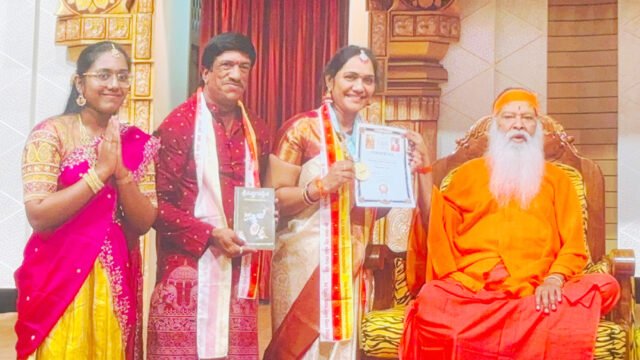 పర్చూరు (Parchuru) : మైసూరు అవధూత దత్త పీఠం జాతీయ స్థాయిలో నిర్వహించిన భగవత్ గీత కంఠస్థ పరీక్షల్లో ఉత్తమ శ్రేణిలో పర్చూరు మండల ఉపాధ్యక్షురాలు కోట ప్రసన్న ఉత్తీర్ణత సాధించారు. మైసూరు దత్త పీఠాధిపతి గణపతి సచ్చిదానంద స్వామి (Mysure Datta Pitham Ganapathi Sachidananda Swami) చేతుల మీదుగా బంగారు పధకం అందుకున్నారు. ఈ సందర్భంగా ఆమె మాట్లాడారు. అవార్డు అందుకోవటం సంతృప్తి ఇచ్చిందని అన్నారు. తల్లిదండ్రులు సంస్కృతం భాషను పిల్లలకు నేర్పించాలని సూచించారు. భారతీయ గ్రంథాలన్నీ సంస్కృతంలోనే ఉన్నాయని విదేశీయులు సైతం ఈ భాష పట్ల ఎక్కువ మక్కువ చూపుతున్నారని అన్నారు. కార్యక్రమంలో ఎస్జిఎస్ శ్రీకల్యాణ వేంకటేశ్వర స్వామి సమేత అష్టలక్ష్మి దేవస్థాన ట్రస్టీ కోటా శ్రీనివాసరావు కుమార్తె డాక్టర్ ఆశాలత ఉన్నారు. ఆలయ కమిటీ ప్రతినిధులు పి సత్యనారాయణ, లగడపాటి వెంకయ్య, కోట సత్యం అభినందించారు.